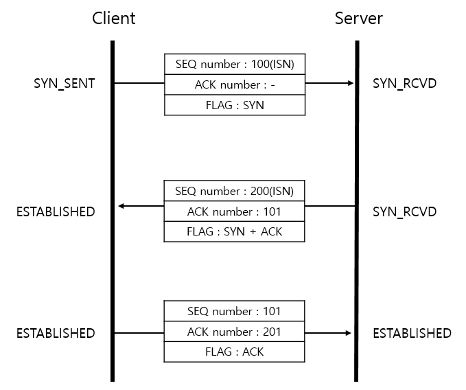 TCP 연결과정은 3단계 절차에 따라 연결이 성립되며, 이때 사용되는 FLAG는 SYN, ACK이다.