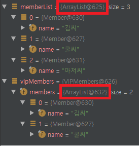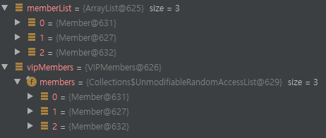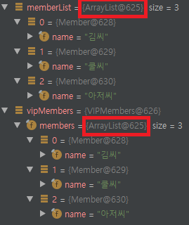main 에서 생성한 memberList 객체와 vipMembers의 내부 필드 객체인 members의 참조값이 일치하는것을 확인할 수 있다.