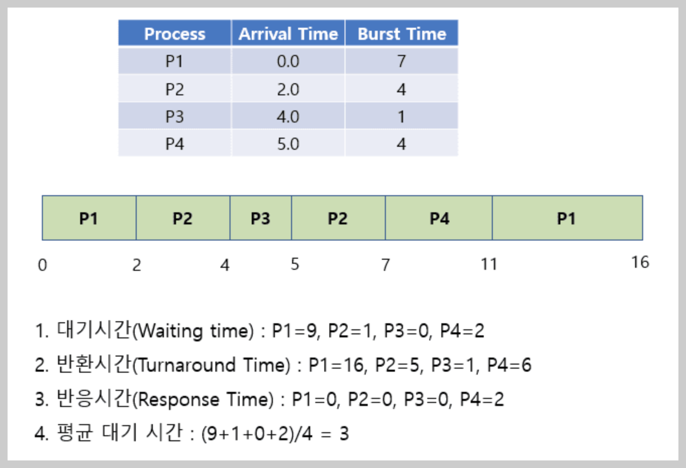 - SRTF 는 평균 대기시간을 줄일 수 있지만 역시 다음 프로세스의 CPU burst time 을 예측하는 것이 어렵다는 문제가 존재한다