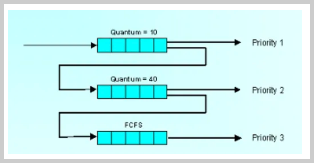 - 멀티레벨 큐 스케줄링 에서는 프로세스들이 영구적으로 하나의 준비 큐에 할당 되었다. 이와 다르게 멀티레벨 피드백 큐 스케줄링 에서는 프로세스가 큐들 사이를 이동하는 것을 허용한다