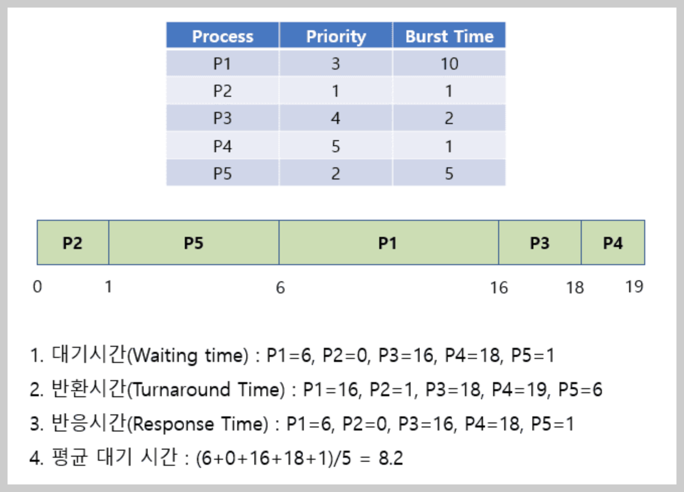 - 우선순위 스케줄링은 각각의 프로세스에 우선수위 넘버가 있는 알고리즘