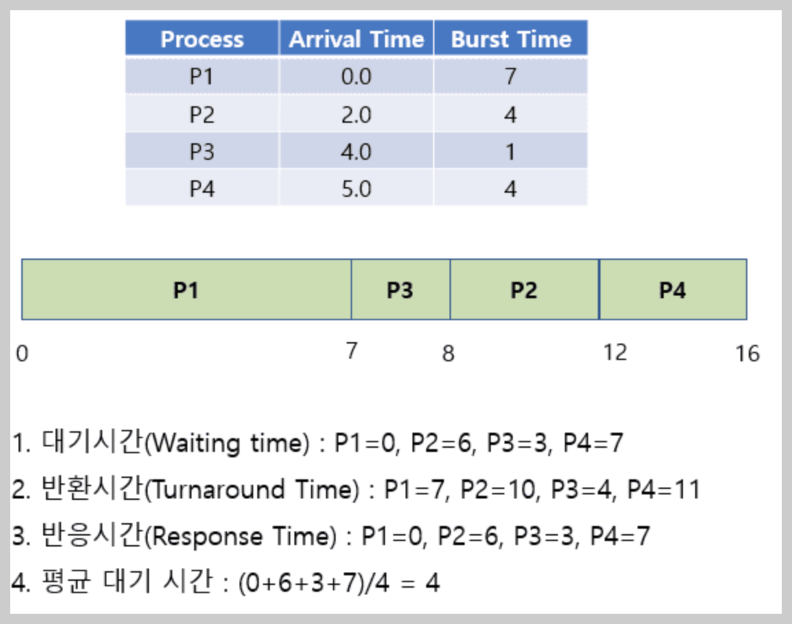 - 또한 긴 시간을 필요로 하는 프로세스가 계속 우선순위가 밀리면서 무기한 대기하게되는 기아(Starvation) 현상이 일어날 수 있다