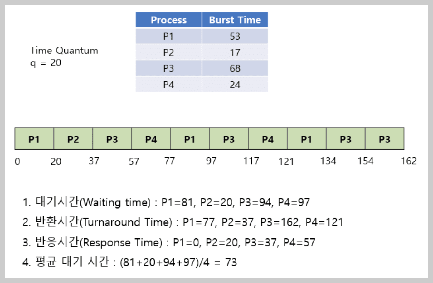 - 현대 컴퓨터가 사용하는 우선순위 스케줄링 이다 각각의 프로세스에 동일한 할당 시간을 부여해서 해당 시간 동안만 CPU 를 이용하게 한다. 할당 시간 내에 처리를 완료하지 못하면 강제 중단 후 다음 작업으로 넘어가므로 선점형 방식이다