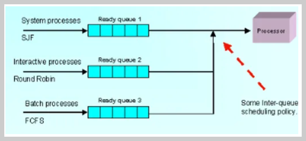 - 따라서 하위 큐로 갈수록 CPU bound 프로세스임을 알 수 있으며 가장 하위 큐는 FCFS 로 스케줄링을 실행한다
