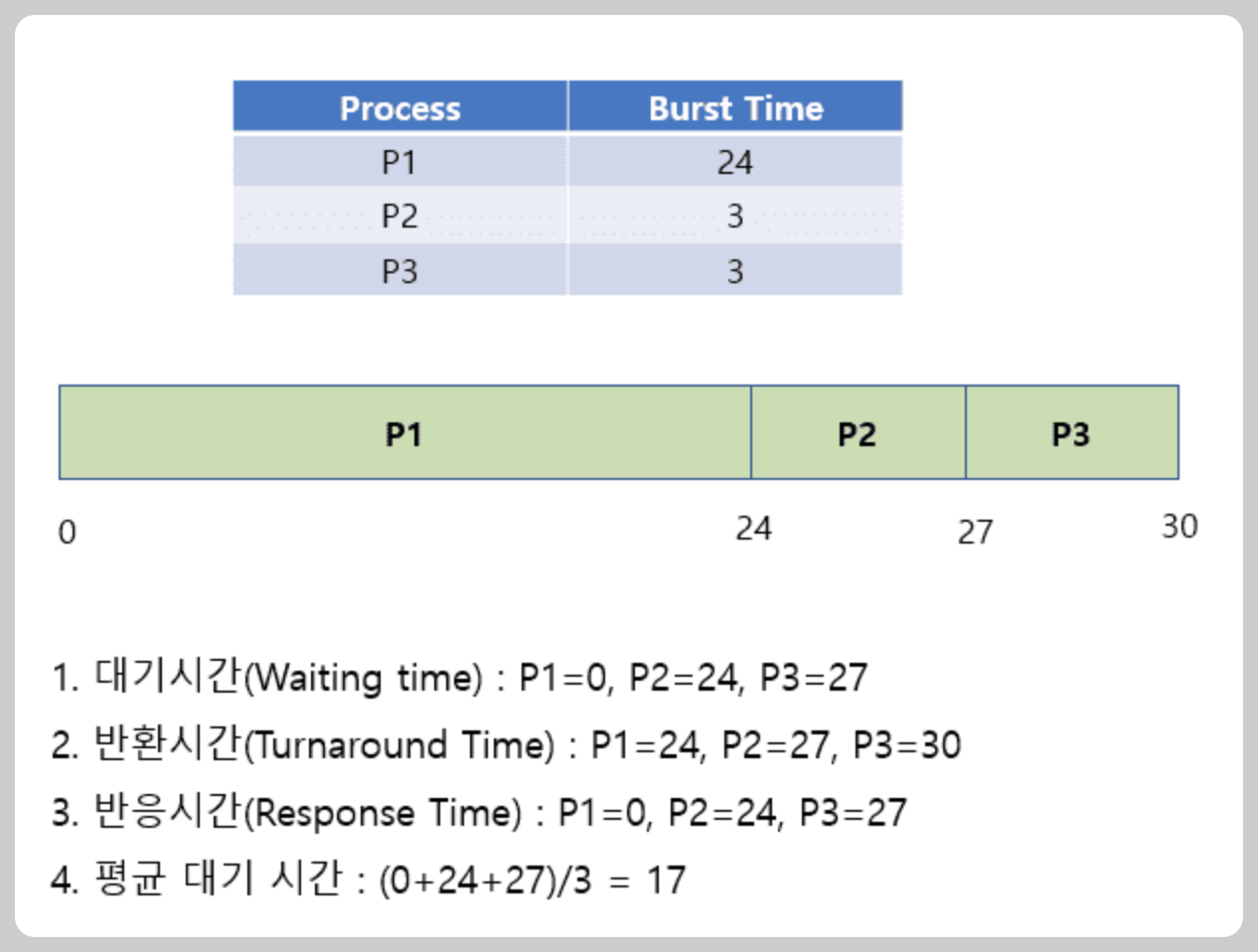 - FCFS 스케줄링은 가장 먼저 요청한 프로세스에 CPU 를 할당해주는 선착순 방식이다